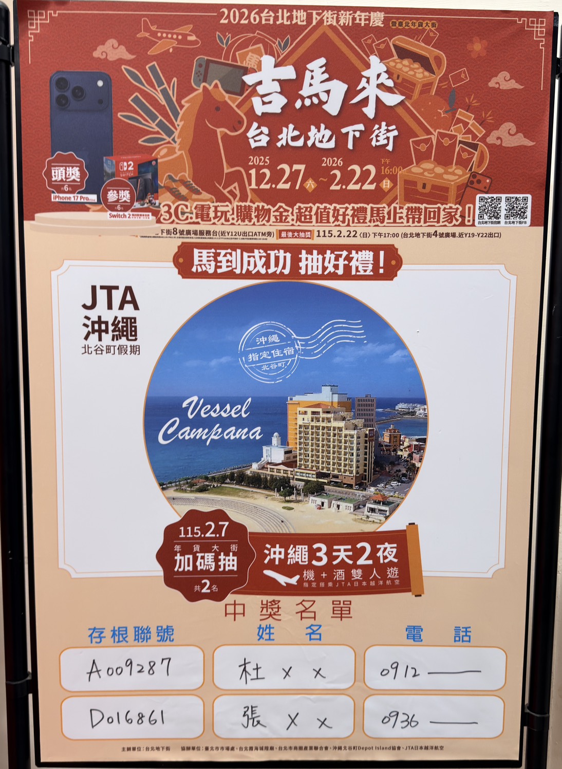 請得獎人攜帶抽獎存根聯、身分證、發票 於115/2/8(日)早上11點起至115/2/15(日) 晚上21:30止 至台北地下街行政中心Y3-Y5間辦公室領取獎品